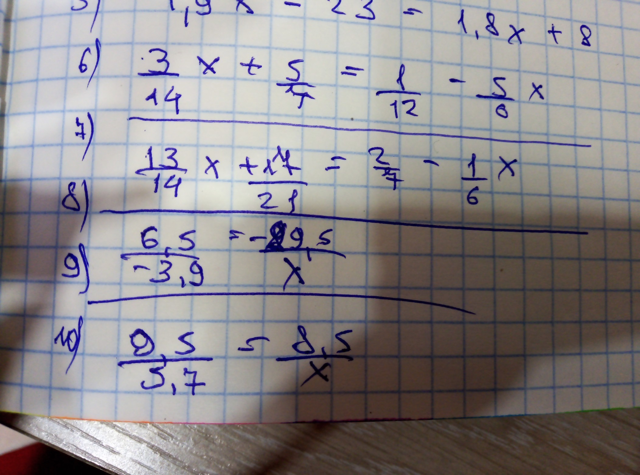 6)3/14х+5/6х=1/12-5/4, 9х+35х /42=1-15 /12, 44х/42= -14/12, 22х/21=-7/6,22х*6=21*(-7), 22х*2=-49, 44х=-49, х=-49/44