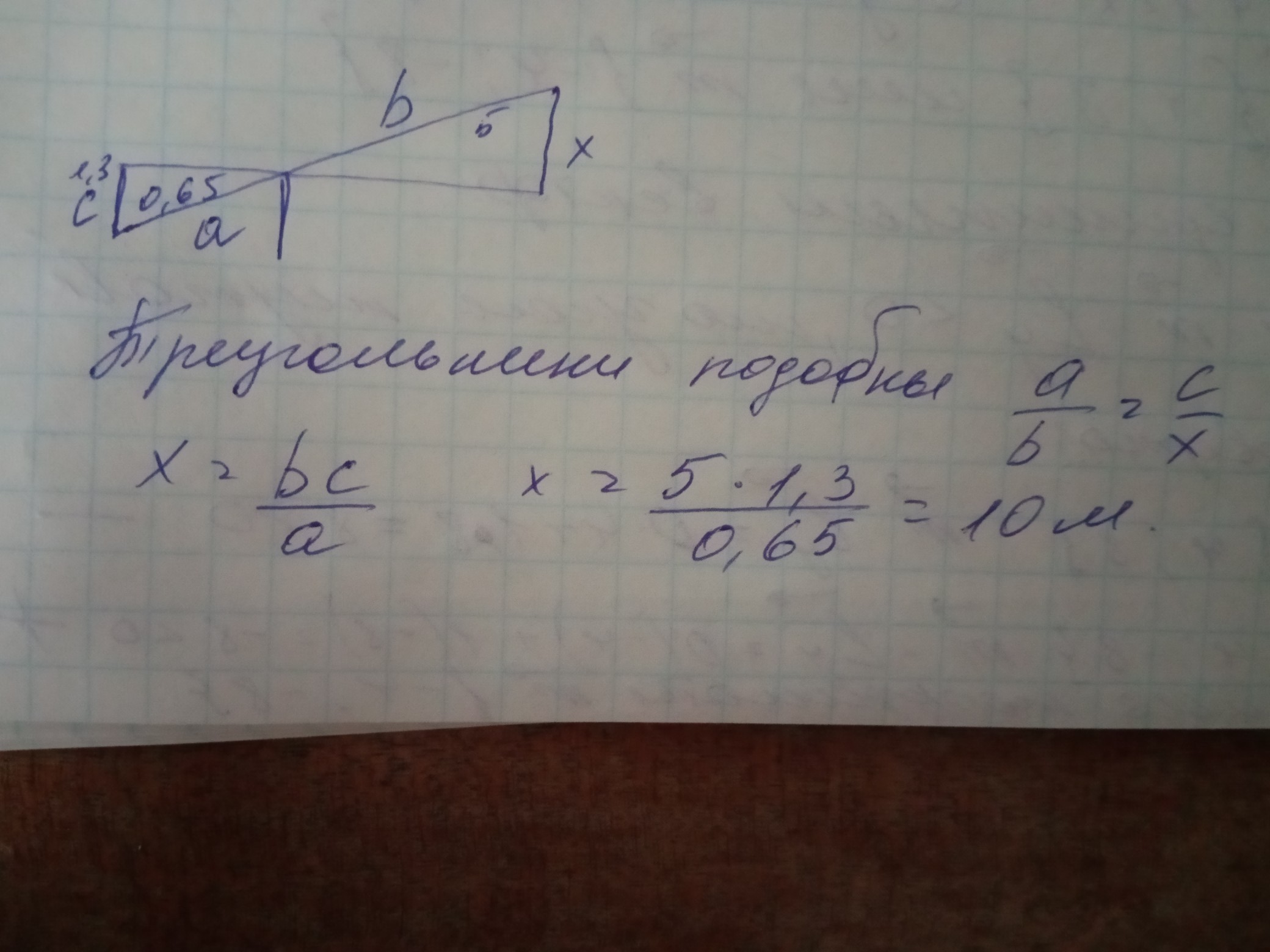 Короткое плечо колодца с журавлем имеет длину 0.65м, а длинное плечо-5м. На сколько метров опустится конец длинного плеча, когда конец короткого поднимется на 1.3м