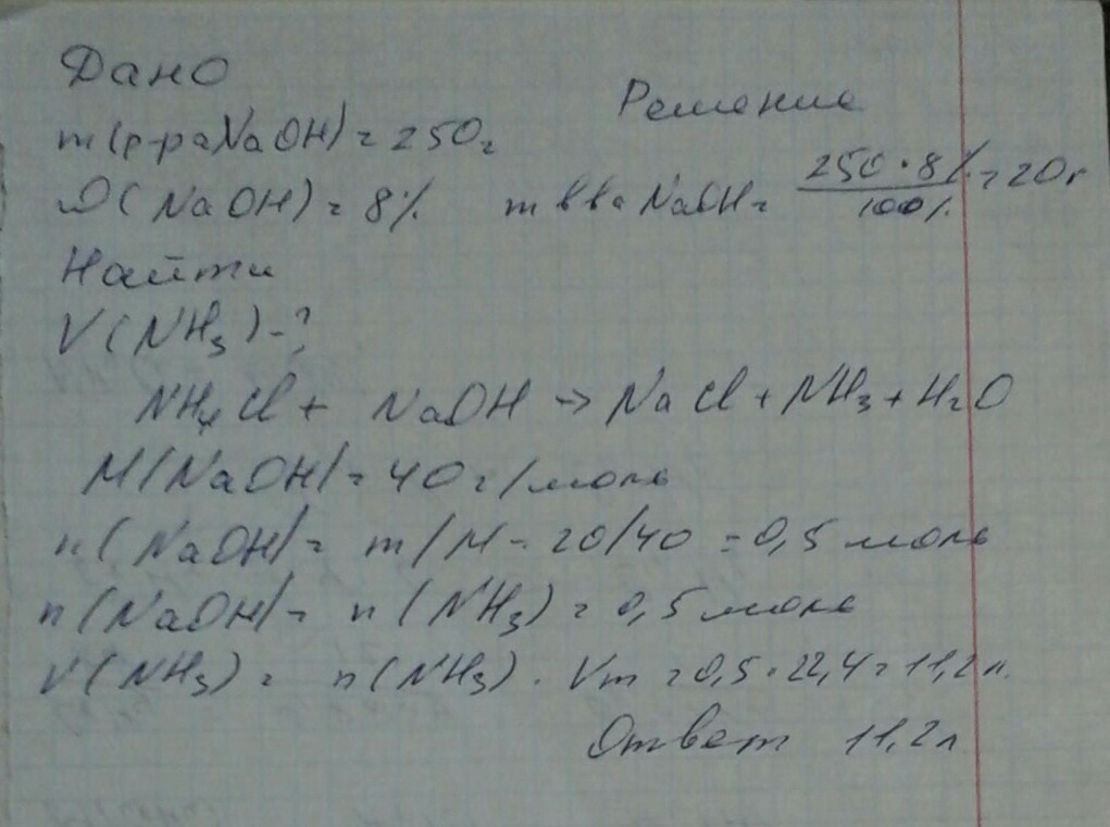 Для получения аммиака из хлорида аммония израсходовали 250 г 8% раствора гидроксида натрия. Объём аммиака (н.у.)