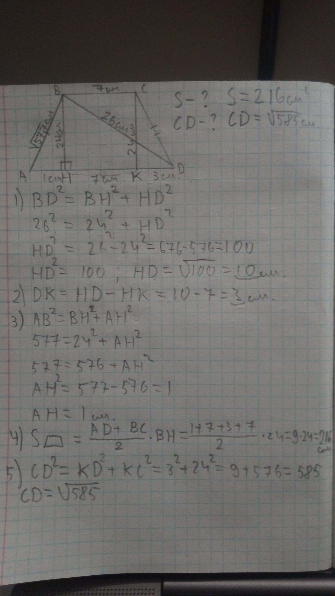В некоторой трапеции диагональ и боковая сторона, выходящие из вершины тупого угла,равны 26см и корень из 577см соответсвенно,высота трапеции-24см,меньшее основание-7см. Найдите площадь трапеции и вторую боковую сторону