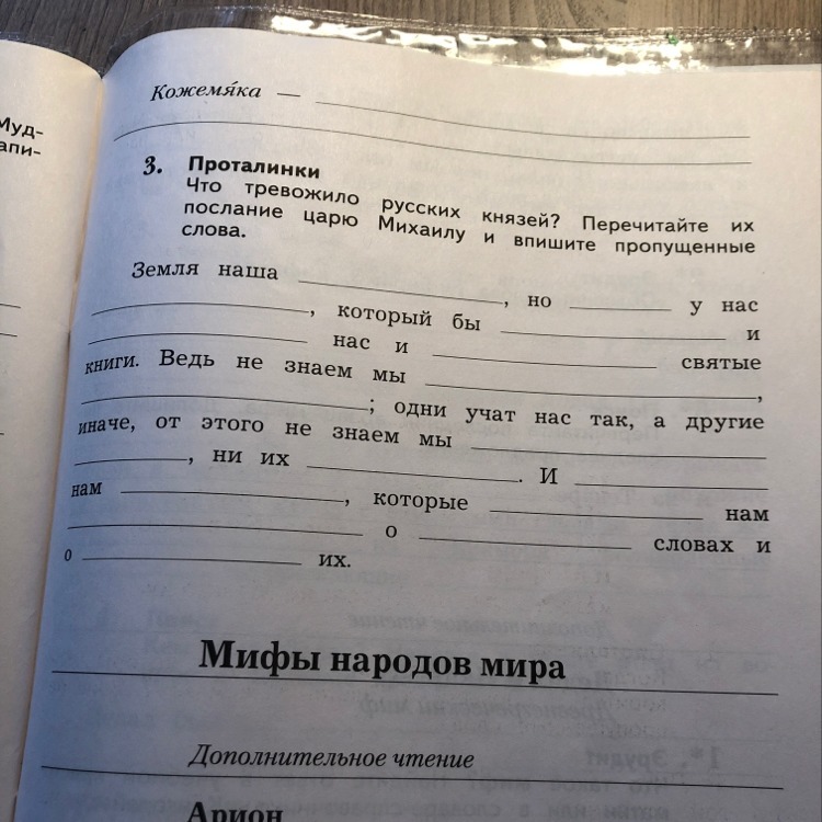 Что тревожило русских князей? Перечитайте их послание царю Михаилу и впишите пропущенные слова.