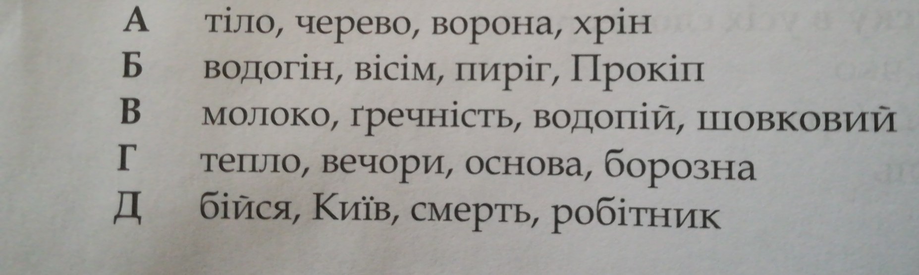 Б)водогін,вісім,пиріг,Прокіп.
