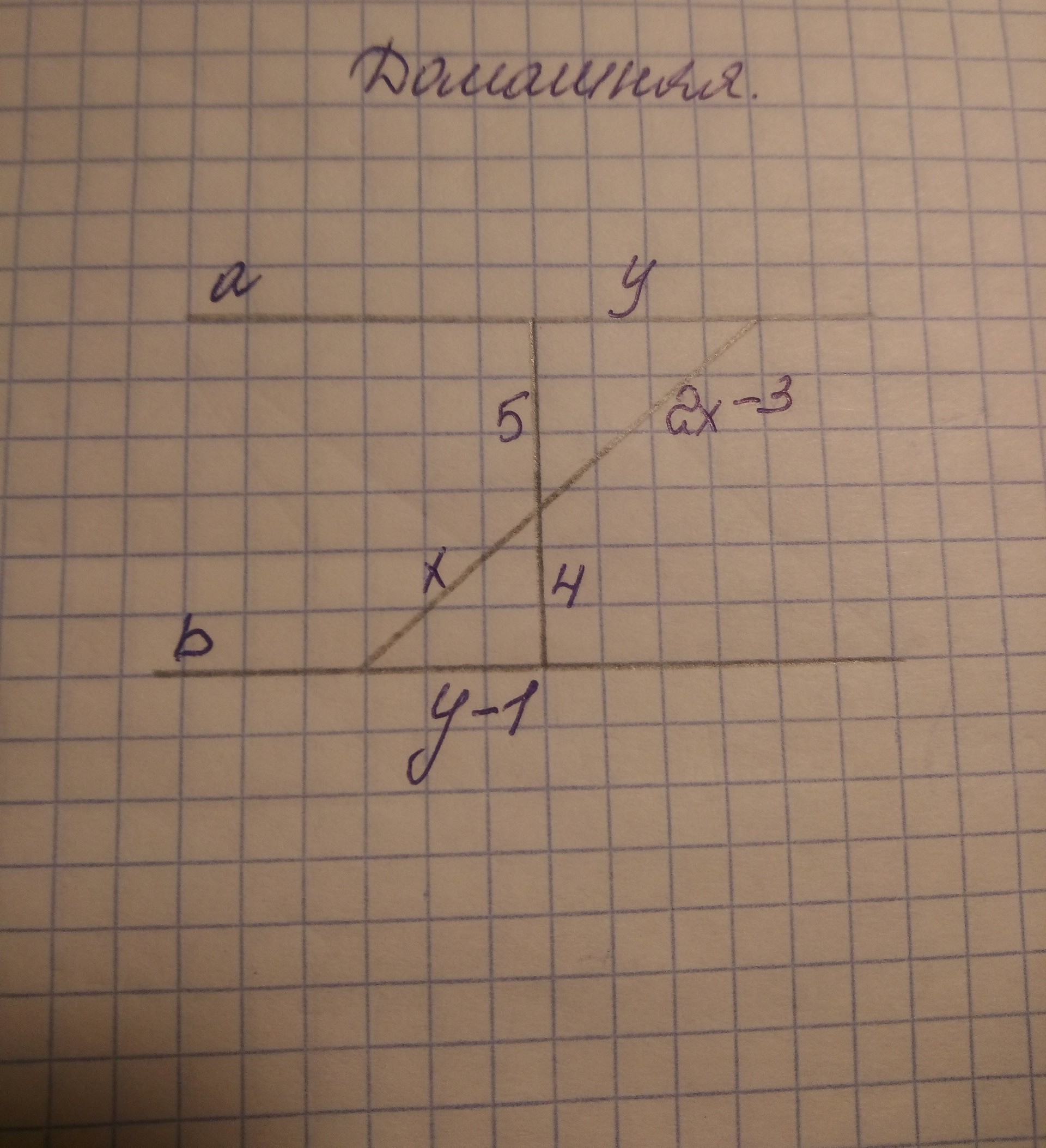 углы в этих тр-х при прямых а и в равны как накрест лежащие, значит тр-ки подобны по двум углам, составим пропорции (2х-3)/х=5/4, 4х-12=5х, х=12, у/(у-1)=5/4, 4у=5у-5, у=5