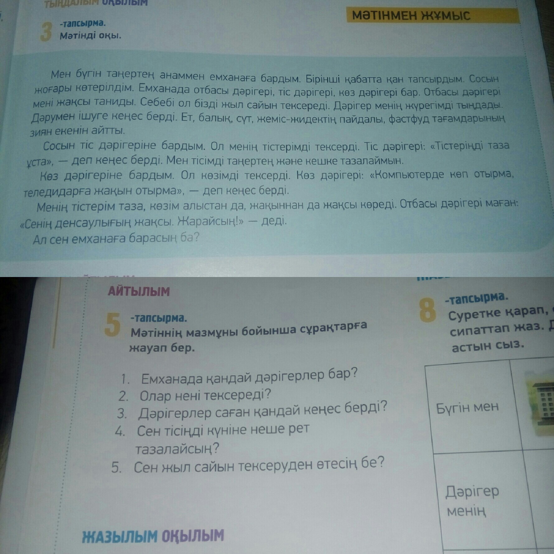2.Тіс дәрігері: тістердің таза ұста - деп кеңес берді. Көз дәрігері: Ол көзімді тексереді. Отбасы дәрігері: денсаулықты тексереді.