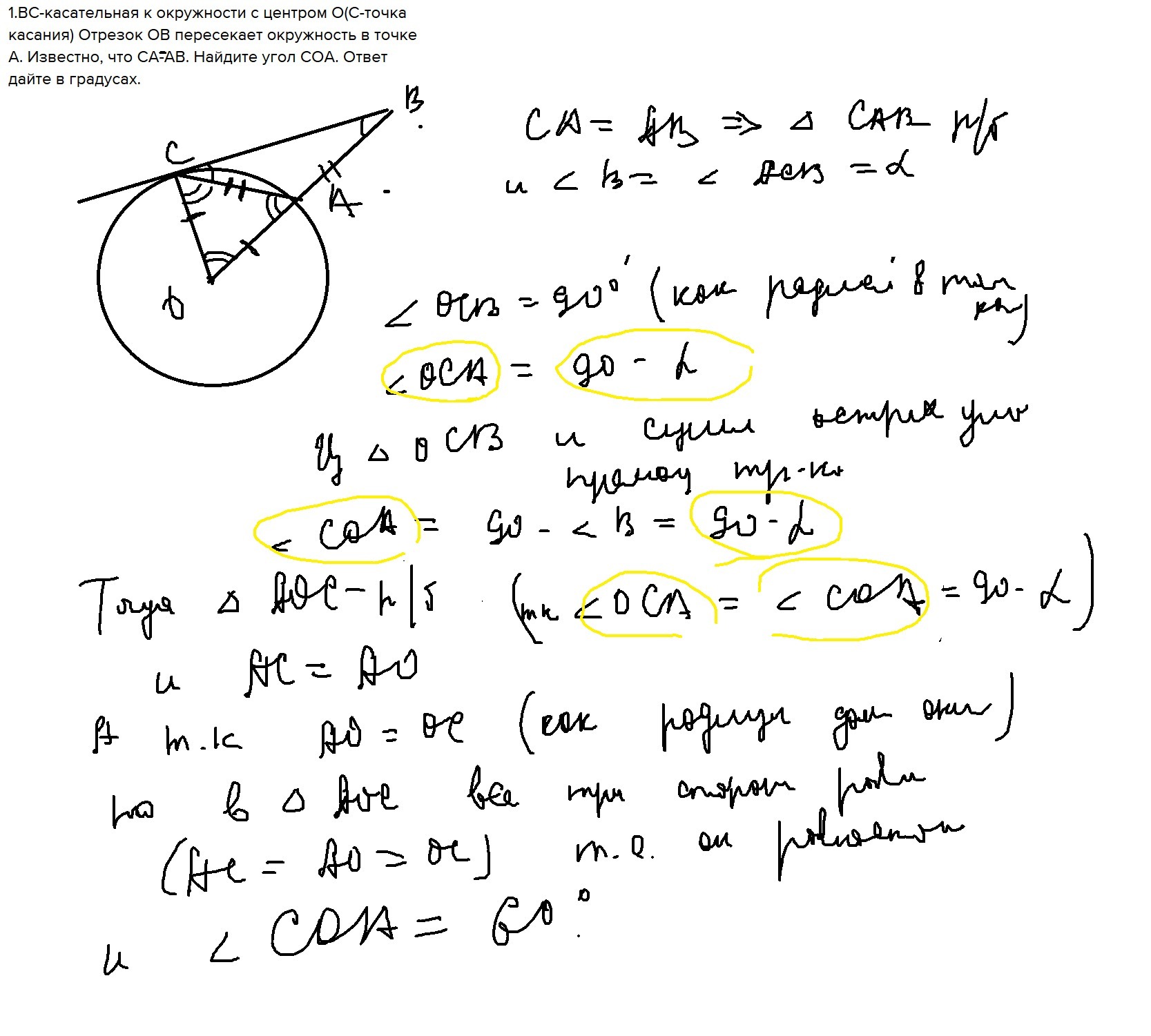 1.BC-касательная к окружности с центром O(С-точка касания) Отрезок ОВ пересекает окружность в точке А. Известно, что СА-АВ. Найдите угол СОА. Ответ дайте в градусах.
