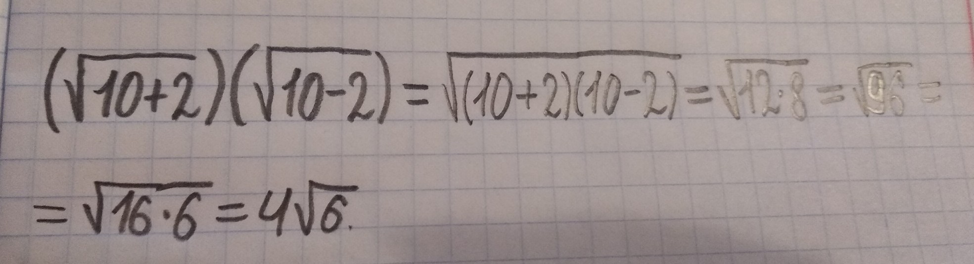 Прежде, чем мы решим возведем то, что в скобках, в один корень. Дальше сложим числа, умножим их, у нас получился результат. Потом мы 96 раскладываем на множители 16 и 6 и у нас получился очередной результат.