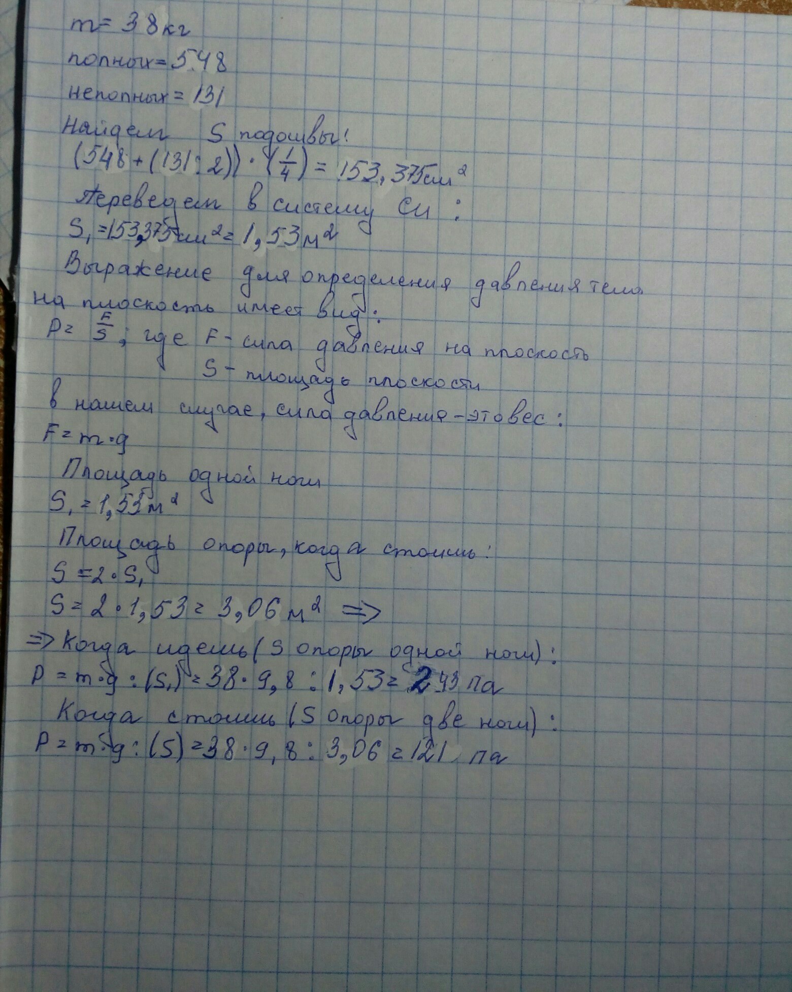 Зная свою массу и площадь ботинка,вычислите,какое давление вы производите при ходьбе и стоя на месте.Указание.Площадь опоры ботинка определите следующим образом.Поставте на лист клетчатой бумаги и обведите контур той части подошвы,на которую опираеться нога.Сосчитайте число полных квадратиков,попавших внутрь контура,и прибавте к нему половину числа неполных квадратиков,через которые прошла линия контура.Полученное число умножте на площадь одного кводратика(площадь квадратика 1/4см(в квадрате))и найдитеплощадь подошвы