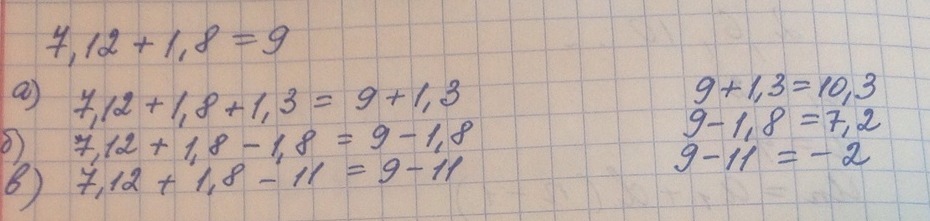 Решите верное числовое равенство которое получится если к обеим частям данного равенства 1)7,2+1,8=9 прибавить: а) 1,3 б)- 1,8 в )-11
