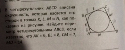в четырехугольник ABCD вписана окружность , которая касается его сторон в точках K,L,M и N, как показано на ртсунке. Найдите периметр четырехугольника ABCD , если известно , что AK=6 , BL=8, CM=7, MD=14
