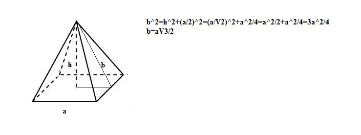 Боковая поверхность состоит из 4 одинаковых равнобедренных треугольника с основанием а и высотой b, которую я сейчас посчитаю...