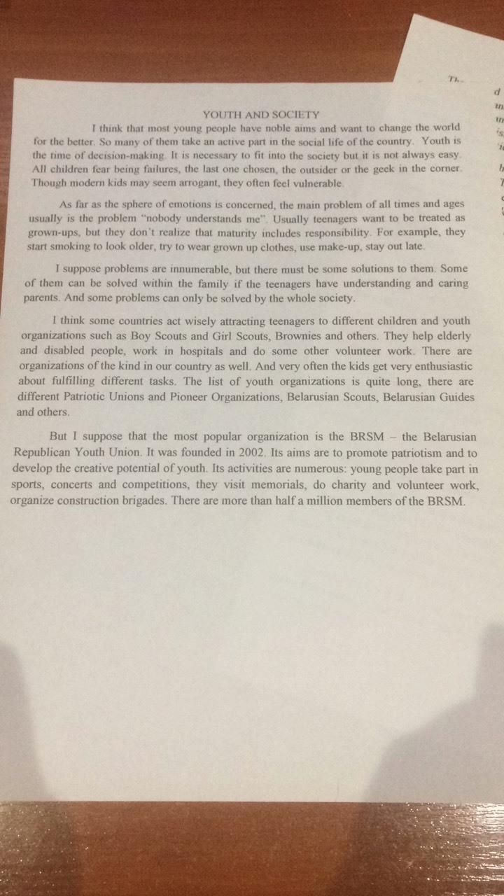 МОЛОДЕЖЬ И ОБЩЕСТВО Я думаю, что большинство молодых людей имеют благородные цели и хотят изменить мир к лучшему. Многие из них принимают активное участие в общественной жизни страны. Молодежь - время принятия решений. Необходимо вписаться в общество, но это не всегда легко. Все дети боятся быть неудачниками, последним из них, посторонним или выродком в углу. Хотя современные дети могут показаться высокомерными, они часто чувствуют себя уязвимыми. Что касается эмоций, то главной проблемой всех времен и возрастов обычно является проблема «меня никто не понимает». Обычно подростки хотят, чтобы к ним относились как к взрослым, но они не понимают, что зрелость включает в себя ответственность. Например, они начинают курить, чтобы выглядеть старше, стараются носить взрослую одежду, использовать косметику, не ложиться спать допоздна. Я полагаю, что проблемы неисчислимы, но должны быть некоторые решения для них. Некоторые из них могут быть решены в семье, если у подростков есть понимающие и заботливые родители. И некоторые проблемы могут быть решены только всем обществом, я думаю, что некоторые страны действуют мудро, привлекая подростков к различным детским и молодежным организациям, таким как бойскауты и девичьи скауты, домовые и другие. Они помогают пожилым людям и инвалидам, работают в больницах и занимаются другой волонтерской работой. Подобные организации есть и в нашей стране. И очень часто дети с энтузиазмом выполняют разные задачи. Список молодежных организаций довольно длинный, есть разные Патриотические союзы и пионерские организации, белорусские скауты, белорусские гиды и др. Республиканский союз молодежи. Он был основан в 2002 году. Его целью является организация строительных бригад. Членов БРСМ насчитывается более полумиллиона. Но я полагаю, что самой популярной организацией является БРСМ - белорусский пропагандировать патриотизм и развивать творческий потенциал молодежи. Его деятельность многочисленна: молодые люди участвуют в спорте, концертах и соревнованиях, посещают мемориалы, занимаются благотворительностью и волонтерством.