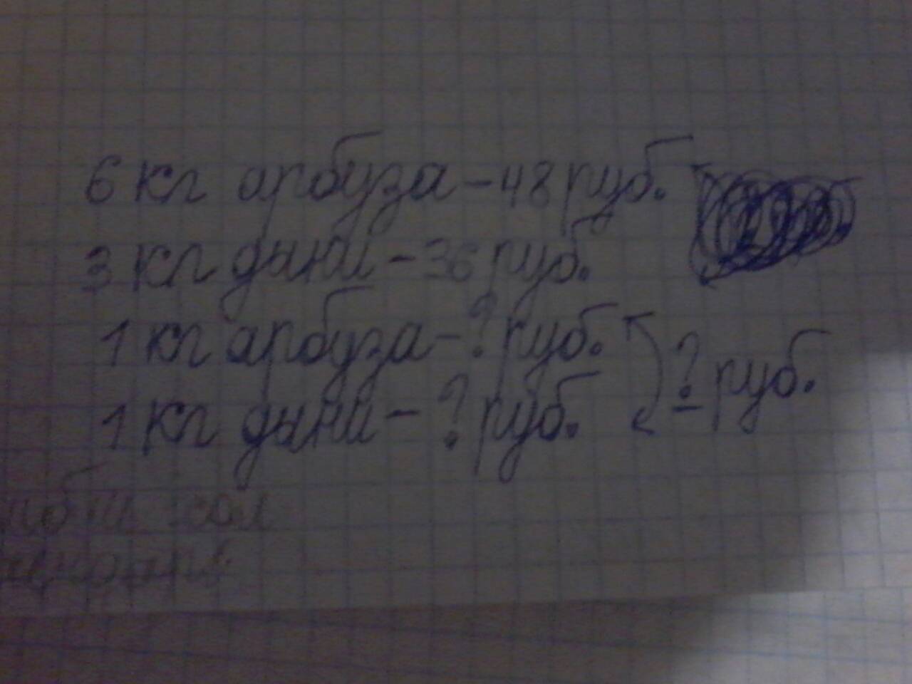 За арбуз массой 6 кг покупательницы заплатила 48 руб. За дыни массой 3 кг 36 руб Что дороже килограмм арбуза или килограмм дыни ?насколько? пожалуйста,