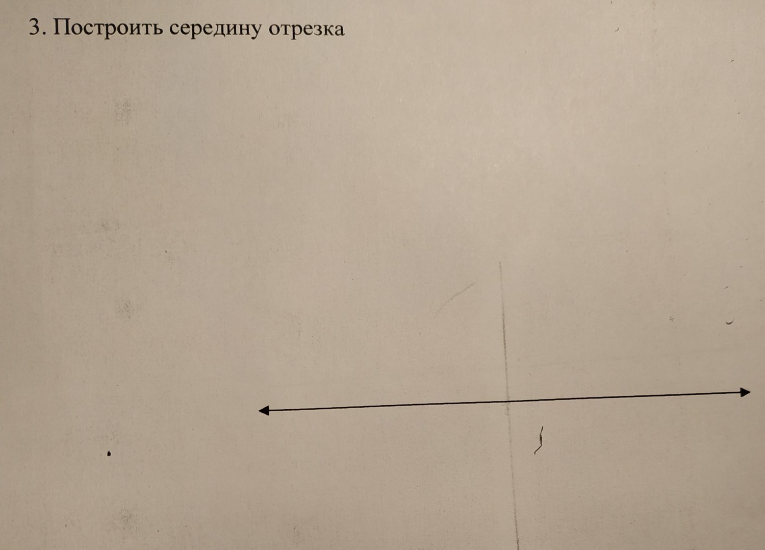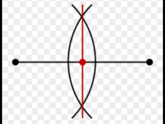 Для нахождения середины отрезкана плоскости можно сначалапостроить две дуги равного (и достаточно большого) радиуса с центрами в концах отрезка, а затем через точки пересечения этих дуг провести прямую. Точка, где полученная прямая пересекаетотрезок, является его серединой.