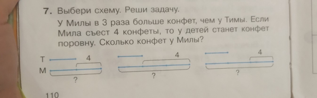 первая схема соответствует условию задачи. 1)3-1=2(ч) на столько частей больше у Милы 2) 4:2=2(к) призодится на одну часть. Значит, столько у Тимы 3) 2*3=6(к) у Милы