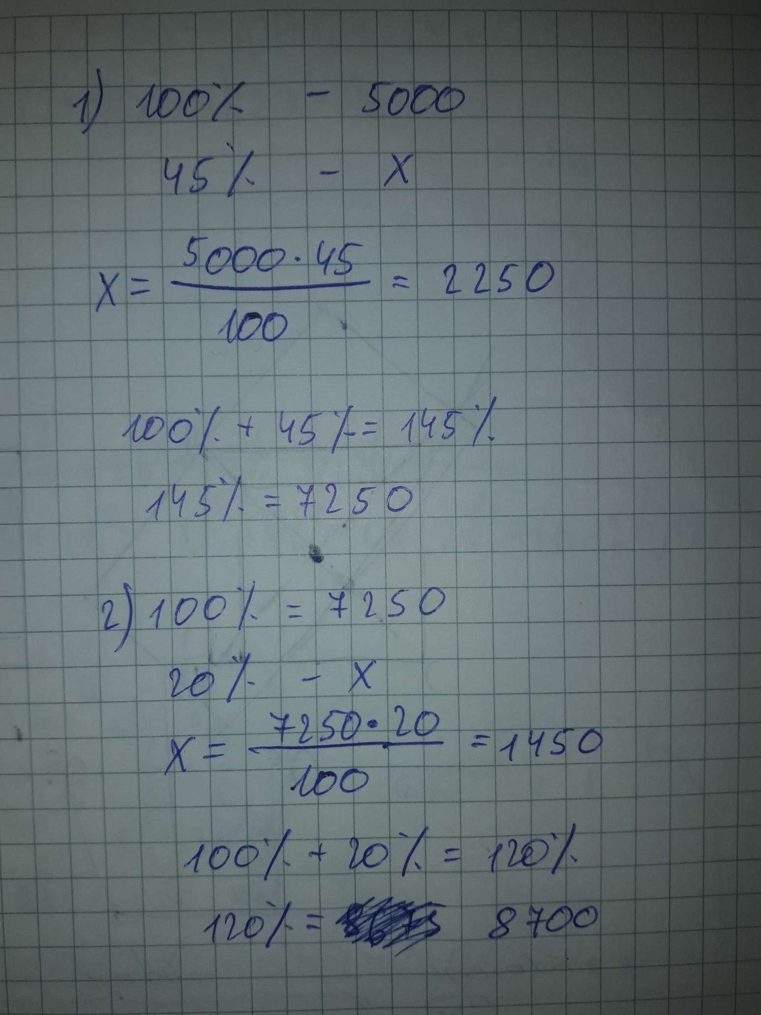 Цену на люстру подняли на 45%, а затем еще и на 20%. Чему равна цена люстры после двух повышений, если сначала она была равна 5000?