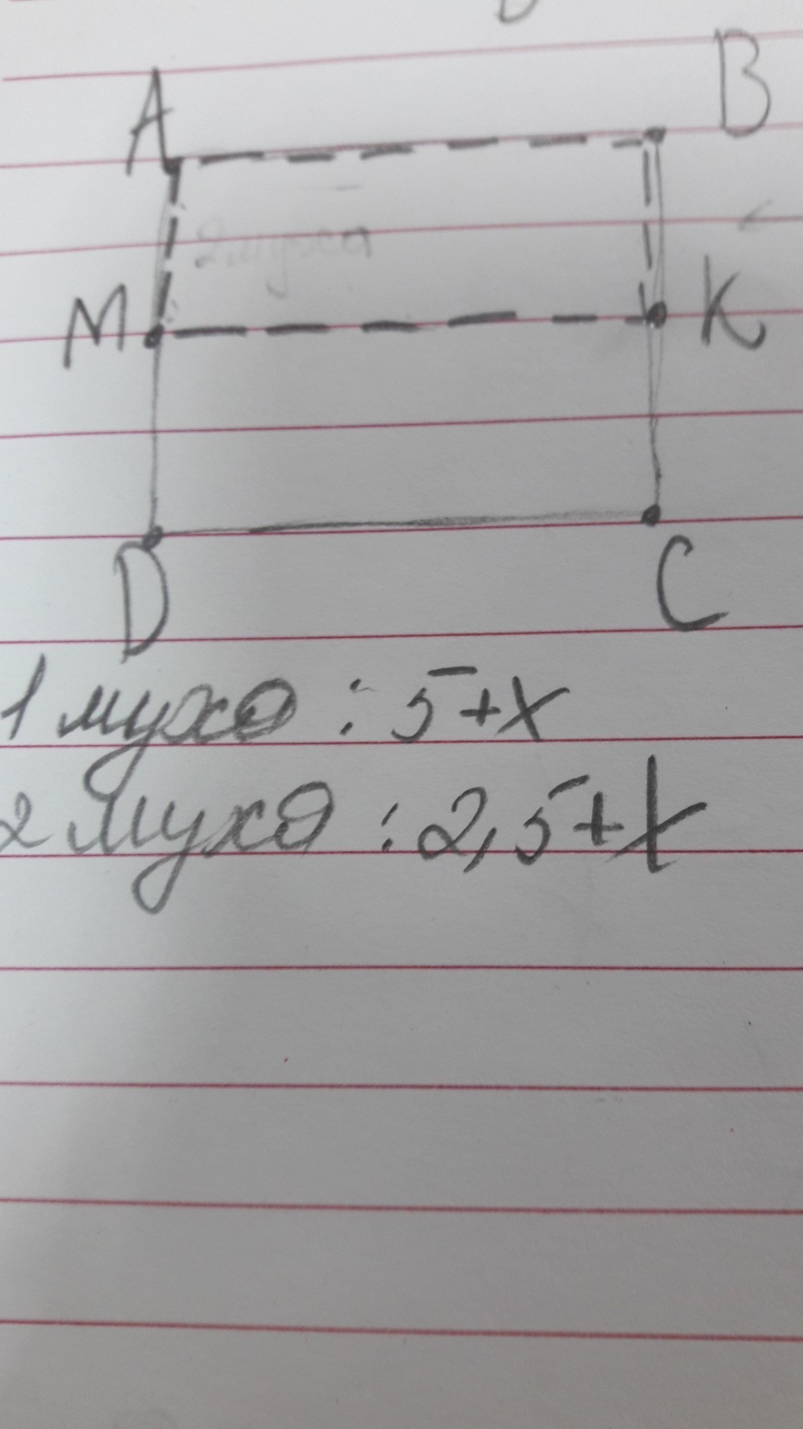 на листе бумаги нарисован большой квадрат ABCD.Точкт K и M-середины сторон BC и AD соответственно.По контуру квадрата с одинаковыми скорости ползут две мухи.Одна проползла по маршруту A-B-C-D-A,а другая-по маршруту A-B-K-M-A.Извесно что первая муха ползлп на 5 минут дольше.сколько времени ползала каждая муха?