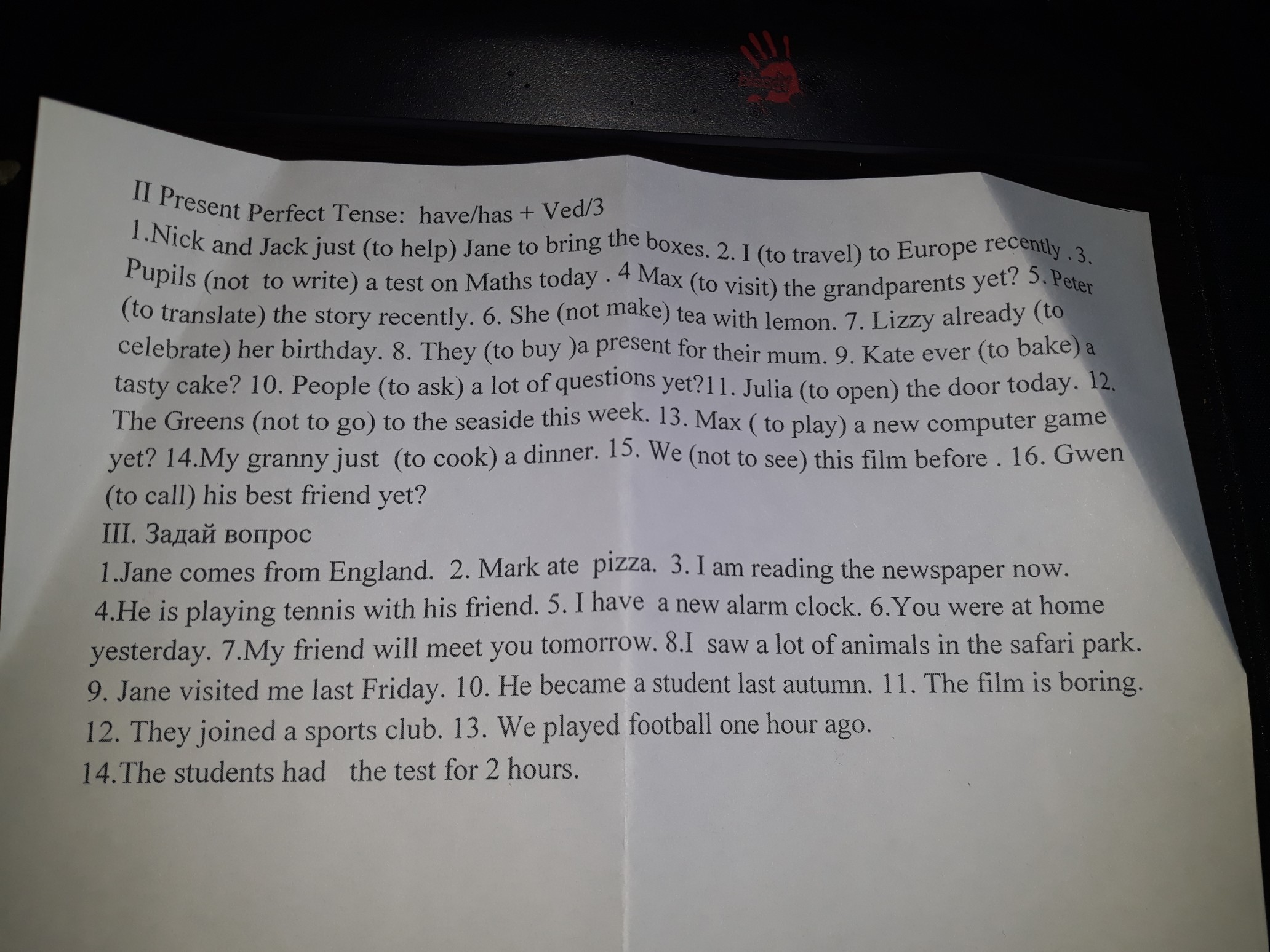 1 Have helped 2 have traveled 3 have not written 4 has visited 5 has translated 6 has not made 7 has celebrated 8 have bought 9 has baked 10 have asked 11 has opened 12 have not went 13 has played 14 has cooked 15 have not seen 16 has called