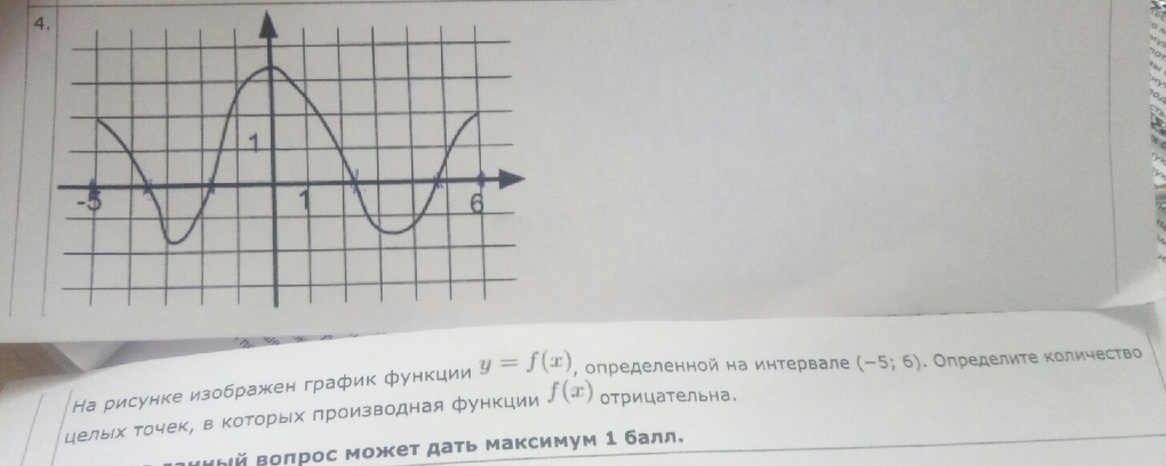 производная отрицательна в точках, где функция убывает, по графику видно, что она убывает в точках: -4, -3, 1, 2, 3. т.е всего 5 точек