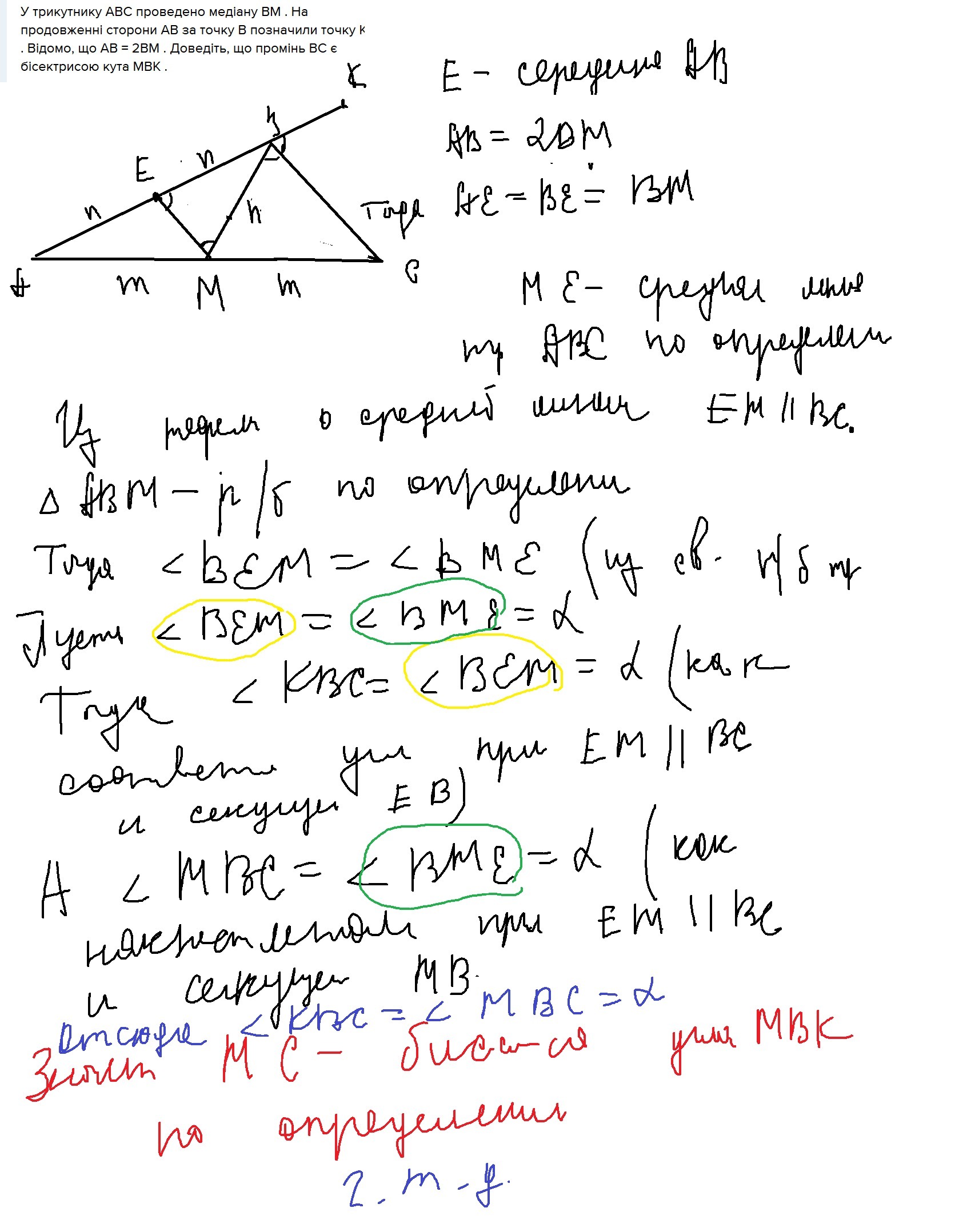 У трикутнику АВС проведено медіану ВМ . На продовженні сторони АВ за точку В позначили точку К . Відомо, що АВ = 2ВМ . Доведіть, що промінь ВС є бісектрисою кута МВК .