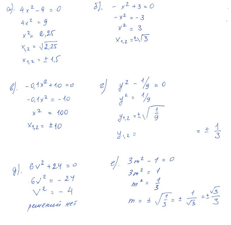 б) -х^2 + 3 = 0; г) у^2 - 1/9 = 0; е) 3m^2 - 1 = 0.