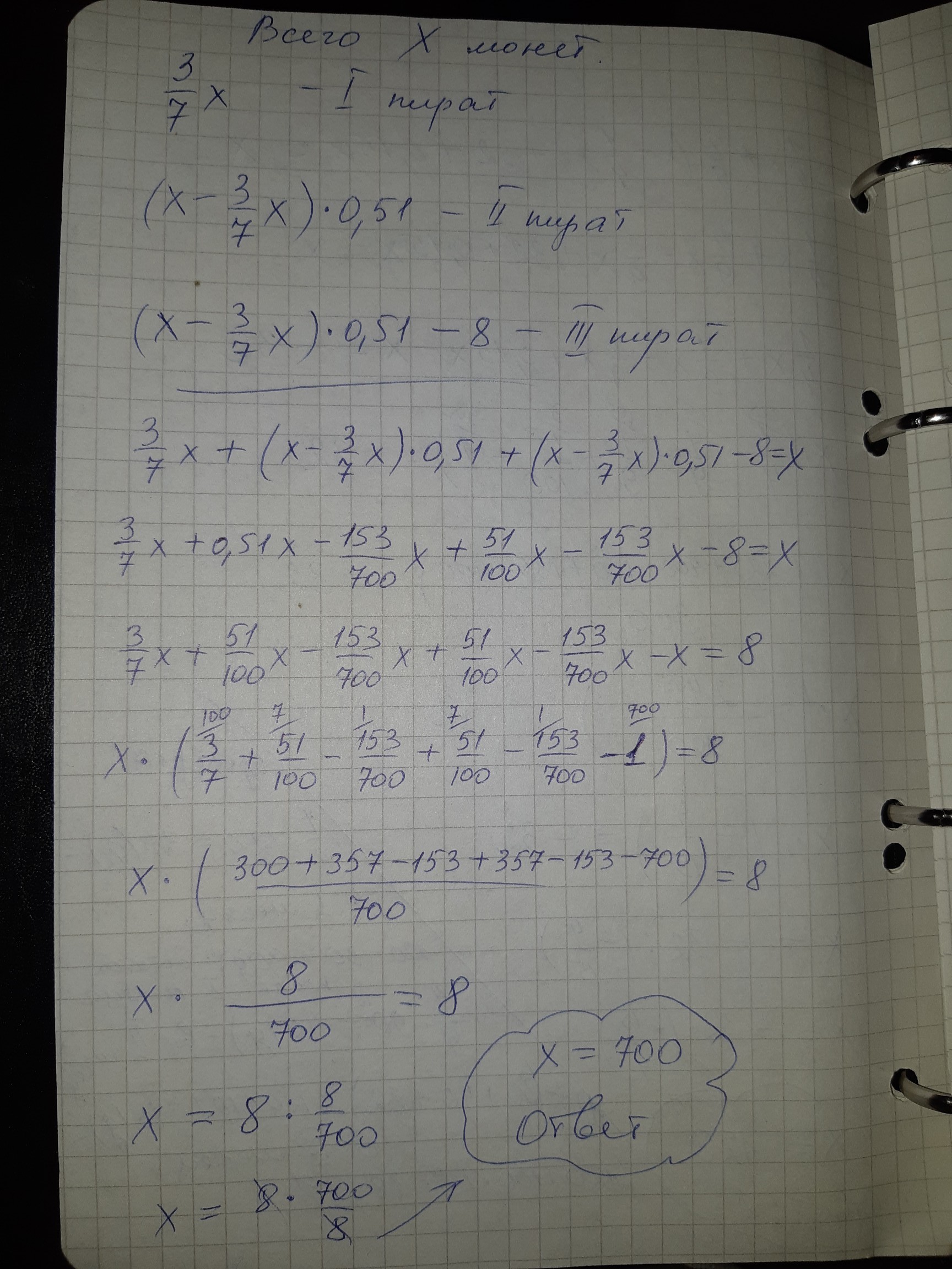 Три пирата делили мешок монет. Первый забрал 3/7 всех монет, второй - 51% остатка, после чего третьему осталось 8 монет меньше,чем у второго. Сколько монет было в мешке? Решить надо уравнением!!