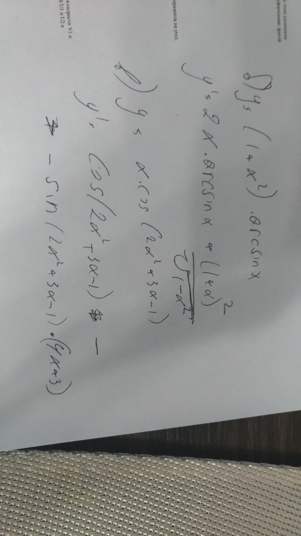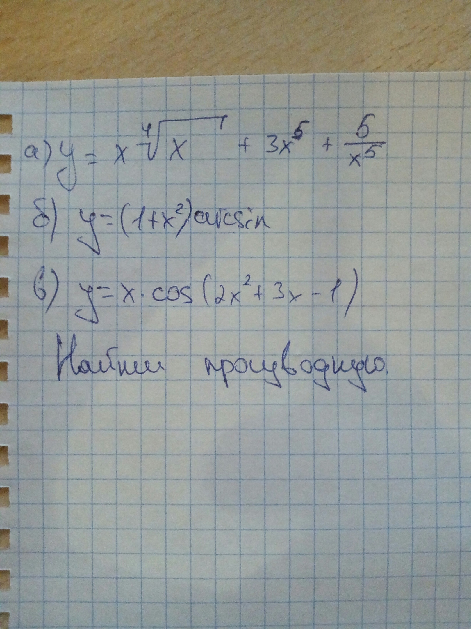 ну расписывать не знаю что, просто загугли таблицу производных и смотри. сначала производная от произведения, потом 2 обычных. (последняя не частного, т.к. сверху константа). во втором производная от умножения и в 3 производная умножения + внутренняя функция