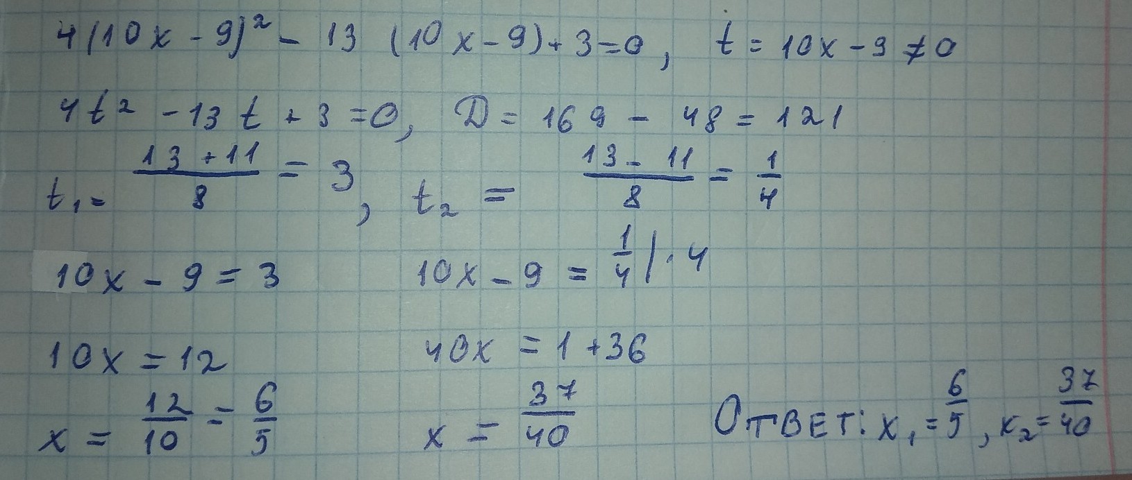 Реши квадратное уравнение 4(10x−9)2−13(10x−9)+3=0