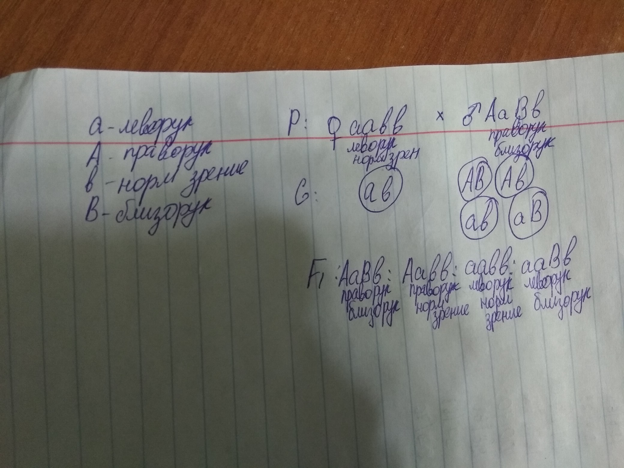 F1: АаВв (праворук, близорук); Аавв (праворук, норм.зрение); аавв (леворук, норм.зрение); ааВв (леворук, близорук)