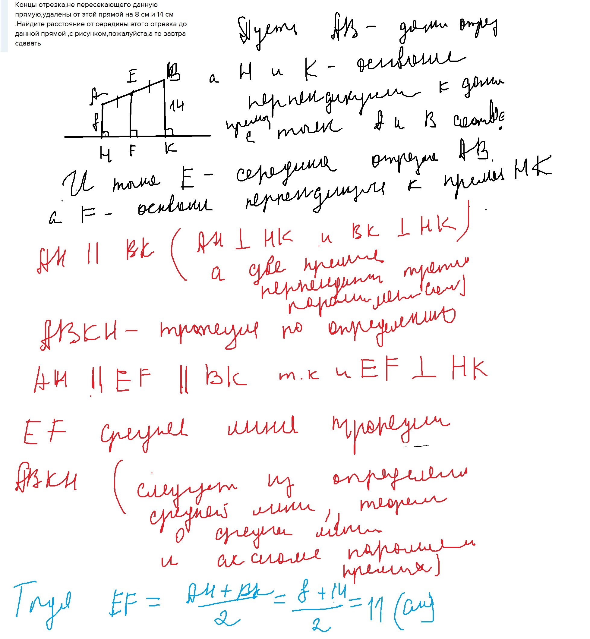 концы отрезка,не пересекающего данную прямую,удалены от этой прямой на 8 см и 14 см .Найдите расстояние от середины этого отрезка до данной прямой ,с рисунком,пожалуйста,а то завтра сдавать