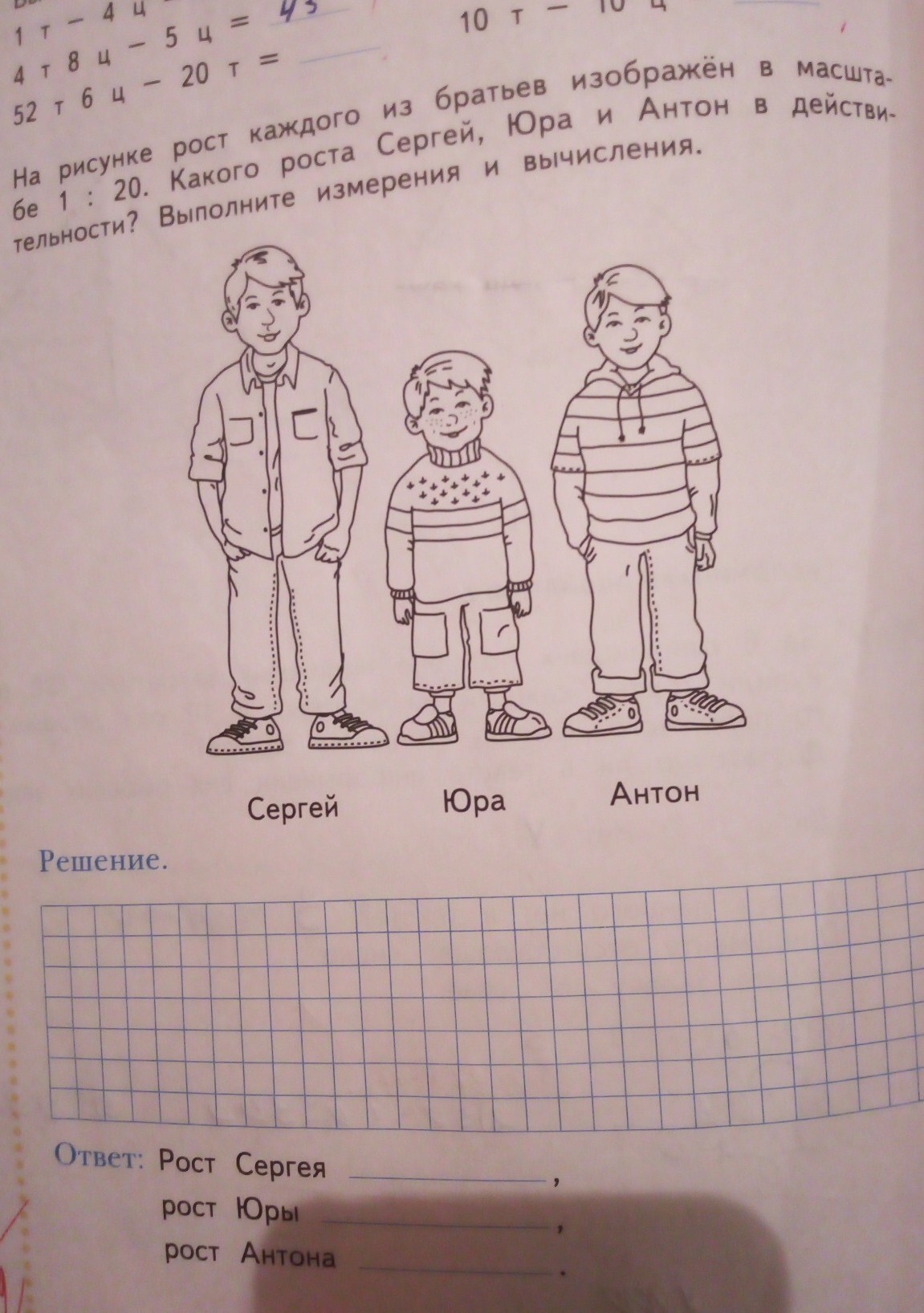 1:20 это значит, что в 1 см на рисунке будет 20 см в реальности. Значит измерь линейкой, сколько см каждый мальчик на рисунке и умножь на 20. Я бы сказала точный ответ, но измерить точно не могу.
