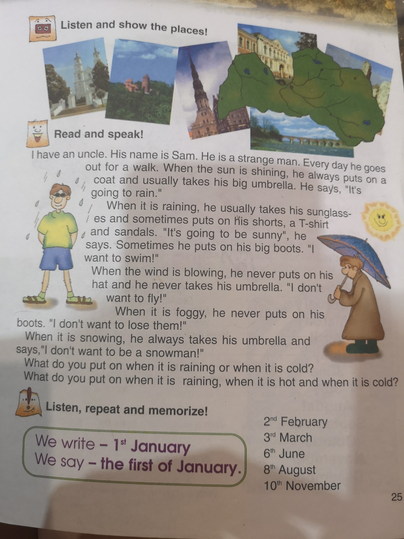 1When it is raining I put on waterproof (водонипроницаемые) clothes. And when it's cold I put on something warm: jacket or something like a coat.