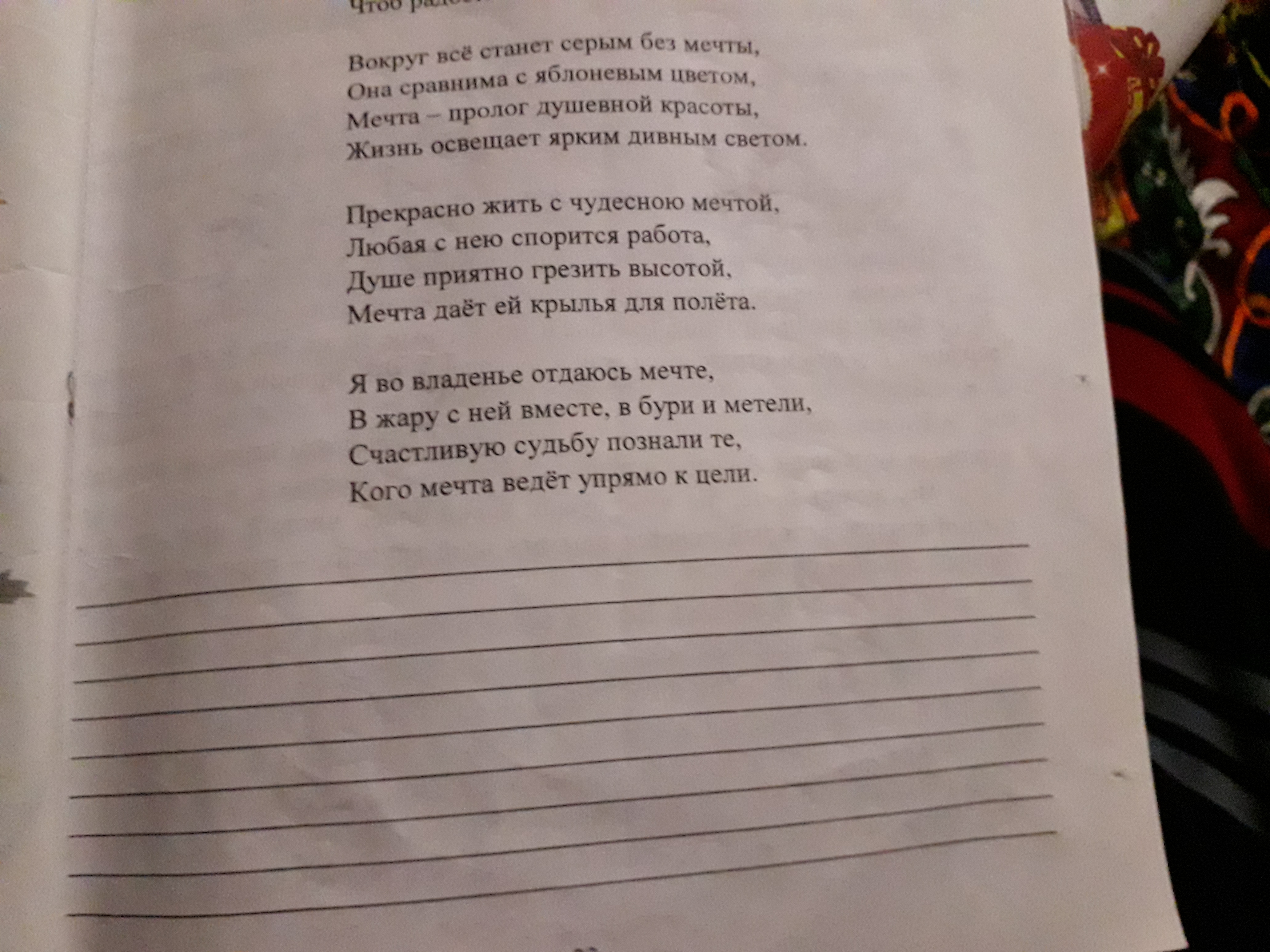 Я думаю, что мечты действительно являются важно частью человеческой жизни. Мечты о прекрасном будущем дают надежду людям отчаявшимся или попавшим в трудную ситуацию . Помогают справится с тяготами серых будней, дают человеку возможность уйти от грустной реальности. Но мечты так и останутся самообманом, если их не превращать в цели, к которым нужно стремиться. Когда человек видит, что его мечты превращаются в реальность, он становится уверенным в себе, целеустремленным и, как правило, достигает успеха.