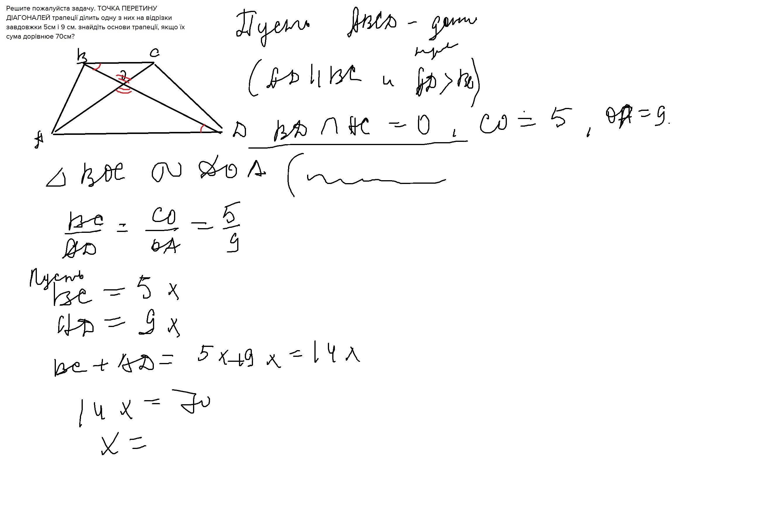 решите пожалуйста задачу. ТОЧКА ПЕРЕТИНУ ДІАГОНАЛЕЙ трапеції ділить одну з них на відрізки завдовжки 5см і 9 см. знайдіть основи трапеції, якщо їх сума дорівнюе 70см?