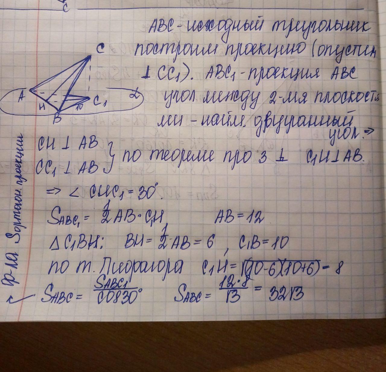 Вычислить площадь треугольника плоскость которого наклонена к проекции под углом 30 градусов,если его проекции-равнобедренный треугольник с БОКОВОЙ СТОРОНОЙ 10 см и ОСНОВАНИЕМ 12