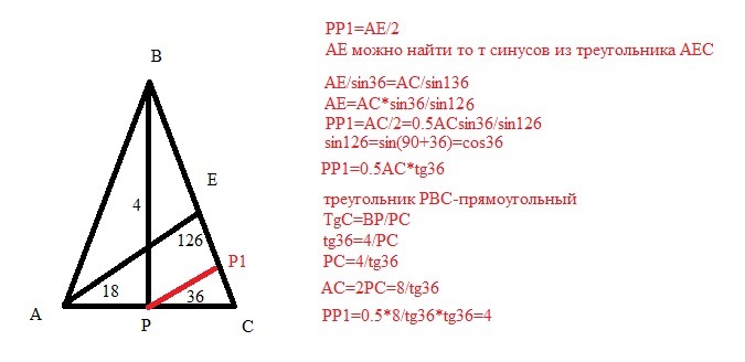 Дан равнобедренный треугольник ABC (AB=BC), BP и AE биссектрисы, причём BP = 4, BCA=36 . Найдите длину средней линии треугольника AEC , параллельной стороне AE .