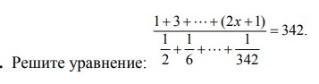 Будем подставлять вместо x целые неотрицательные числа. При x = 0, 2x + 1 = 1, при x = 1, 2x + 1 = 3, при x = 2, 2x + 1 = 5 т. е. ряд в числителе дроби образует арифметическую прогрессию c разностью d = 2, где первый член a₁ = 1, второй a₂ = a₁ + d = 3 и т. д. Рассмотрим ряд в знаменателе дроби. Представим его в виде 1/2 + 1/6 + ... + 1/342 = 1/1*2 + 1/2*3 + ... + 1/18*19. Найдем сумму этого ряда. Т. к. для натуральных n имеет место равенство 1/n*(n+1) = 1/n - 1/(n+1), то применим это равенство последовательно для всех n от 1 до 18. Получим 1/2 + 1/6 + ... + 1/342 = (1 - 1/2) + (1/2 - 1/3) + (1/3 - 1/4) + ... + (1/18 - 1/19) = 1 - 1/19 = 18/19. Таким образом 1 + 3 + ... + (2x + 1) = 342*18/19 = 18*19*18/19 = 18². Сумму арифметической прогрессии в числителе находим по формуле ((a₁ + aₙ)/2)((aₙ - a₁)/(a₂ - a₁) + 1). У нас a₁ = 1, a₂ = 3 и aₙ = 2x+1. Тогда сумма 1 + 3 + ... + (2x + 1) = ((1 + 2x + 1)/2)((2x + 1 - 1)/(3 - 1) + 1) = (2(x + 1)/2)(2x/2 + 1) = (x + 1)(x + 1) = (x + 1)². Окончательно имеем (x + 1)² = 18² => x + 1 = 18 => x = 17.