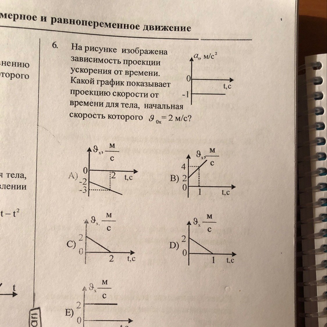 Ускорение по данному графику а=-1 м/с². Уравнение скорости р/з движения (проекции) в общем виде и в нашем случае v(t)=Vo+at=2-1*t м/с. Вычисляем и смотрим: t=0 v=2 м/с, a v=0 при t=2c -подходит только С) -ответ