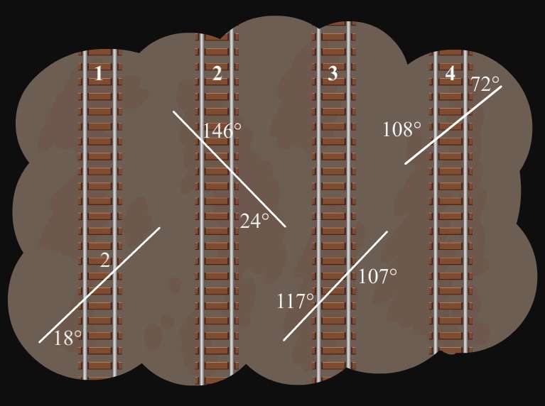 по 4-ому, т.к 180-108=72 => т.к. два накрестлежащих угла равны, то рельсы будут параллельны