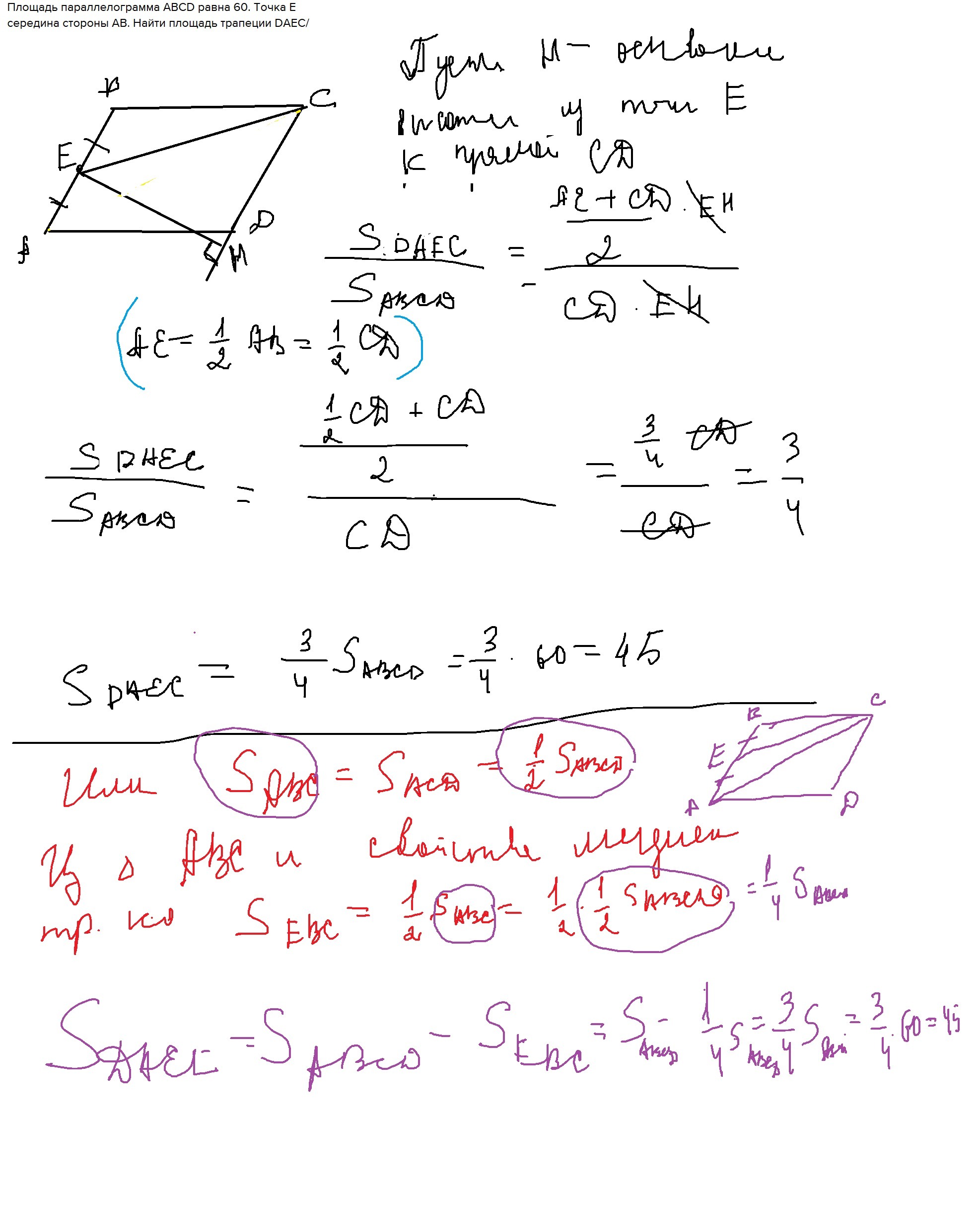 Площадь параллелограмма АВСD равна 60. Точка Е середина стороны АВ. Найти площадь трапеции DAEC/