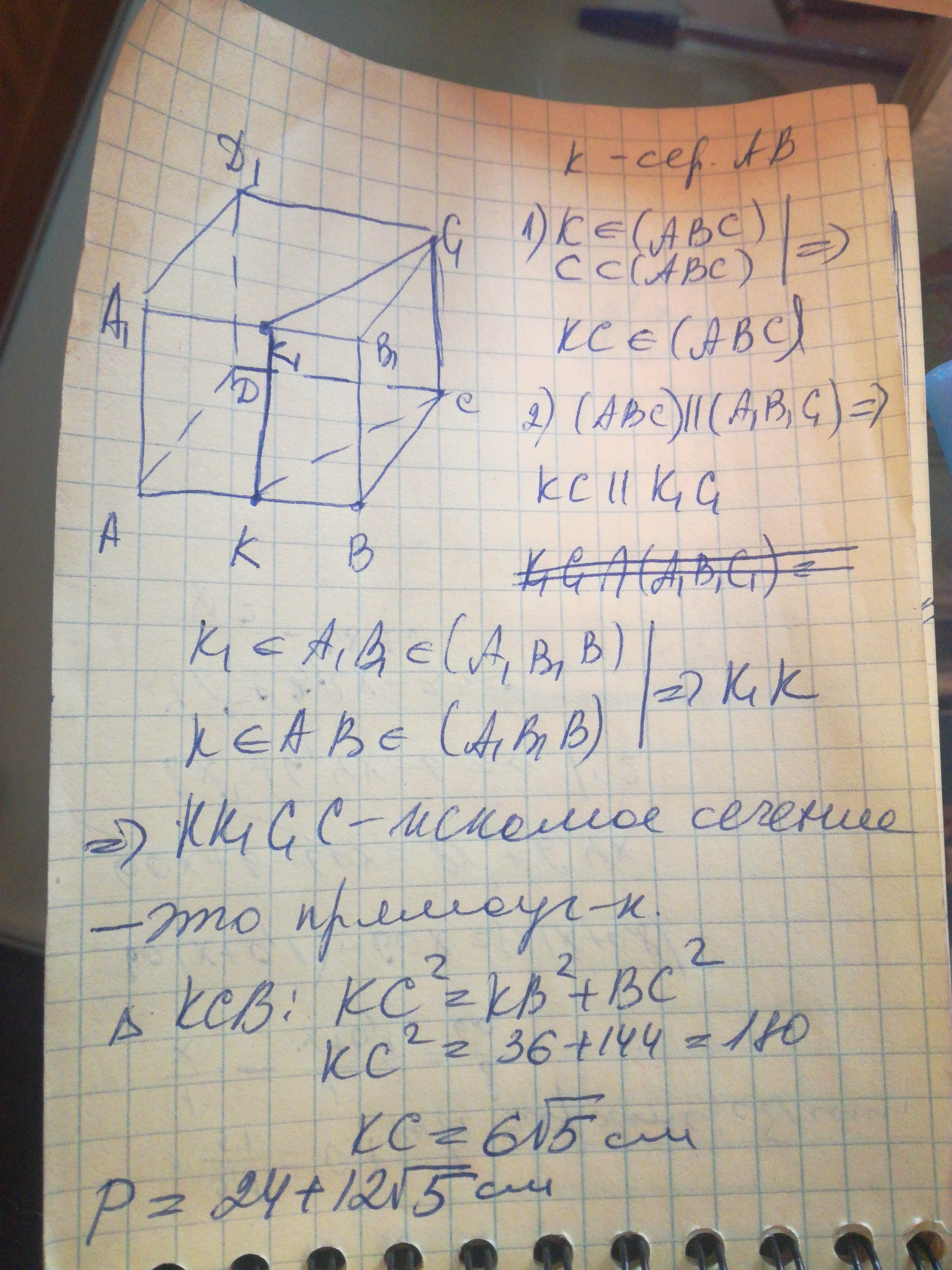 Дан куб ABCDA1B1C1D1,ребро которого равно 12см постройте его сечение плоскостью АЛЬФА , проходящей через ребро CC1 и середину ребра AB . НАЙДИТЕ ПЕРИМЕТР СЕЧЕНИЯ