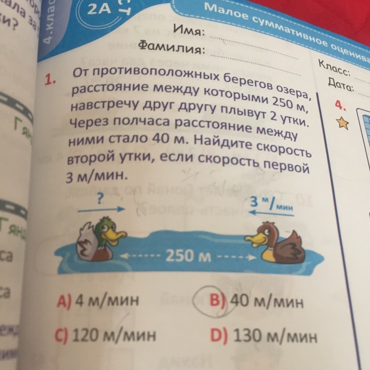 1. 250-40=210 м проплыли вместе утки за 30 минут.