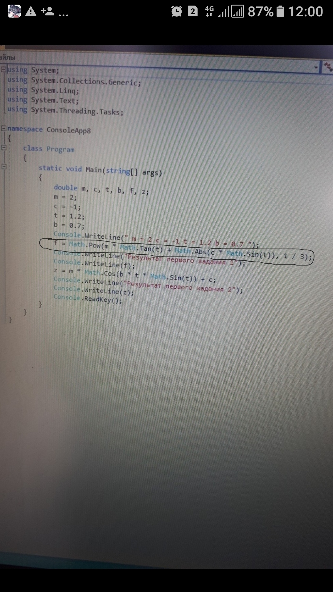 x = m * Math.Tan(t) + Math.Abs(c * Math.Sin(t))