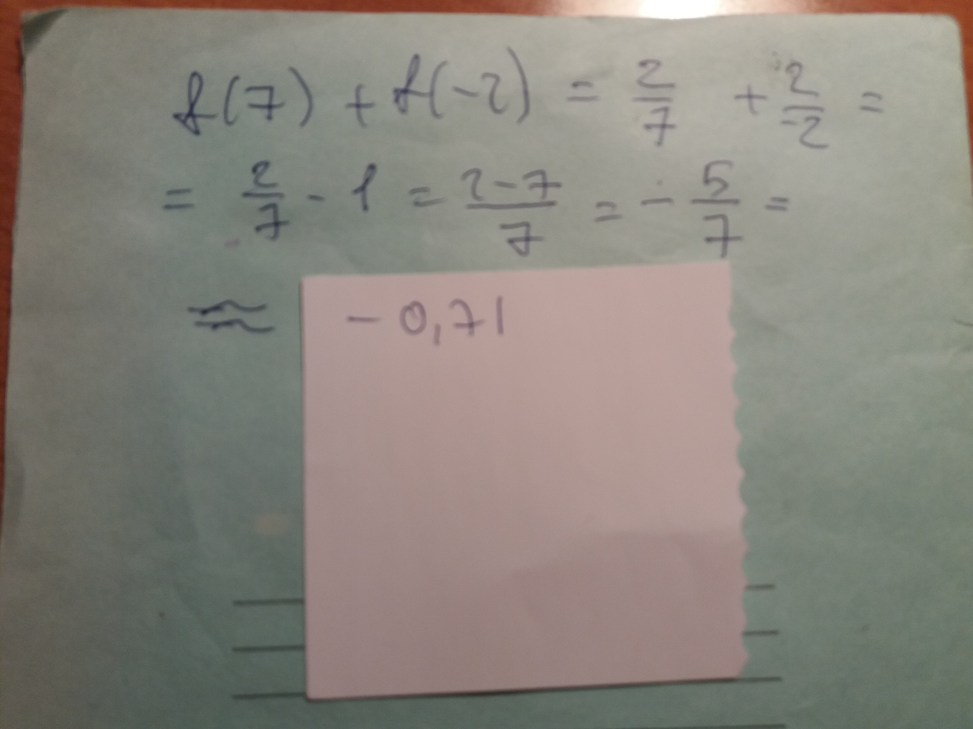 Функция задана формулой f(x)=2/x. Вычисли f(7)+f(-2) (При необходимости округли ответ до сотых). Ответ: f(7)+f(-2)=