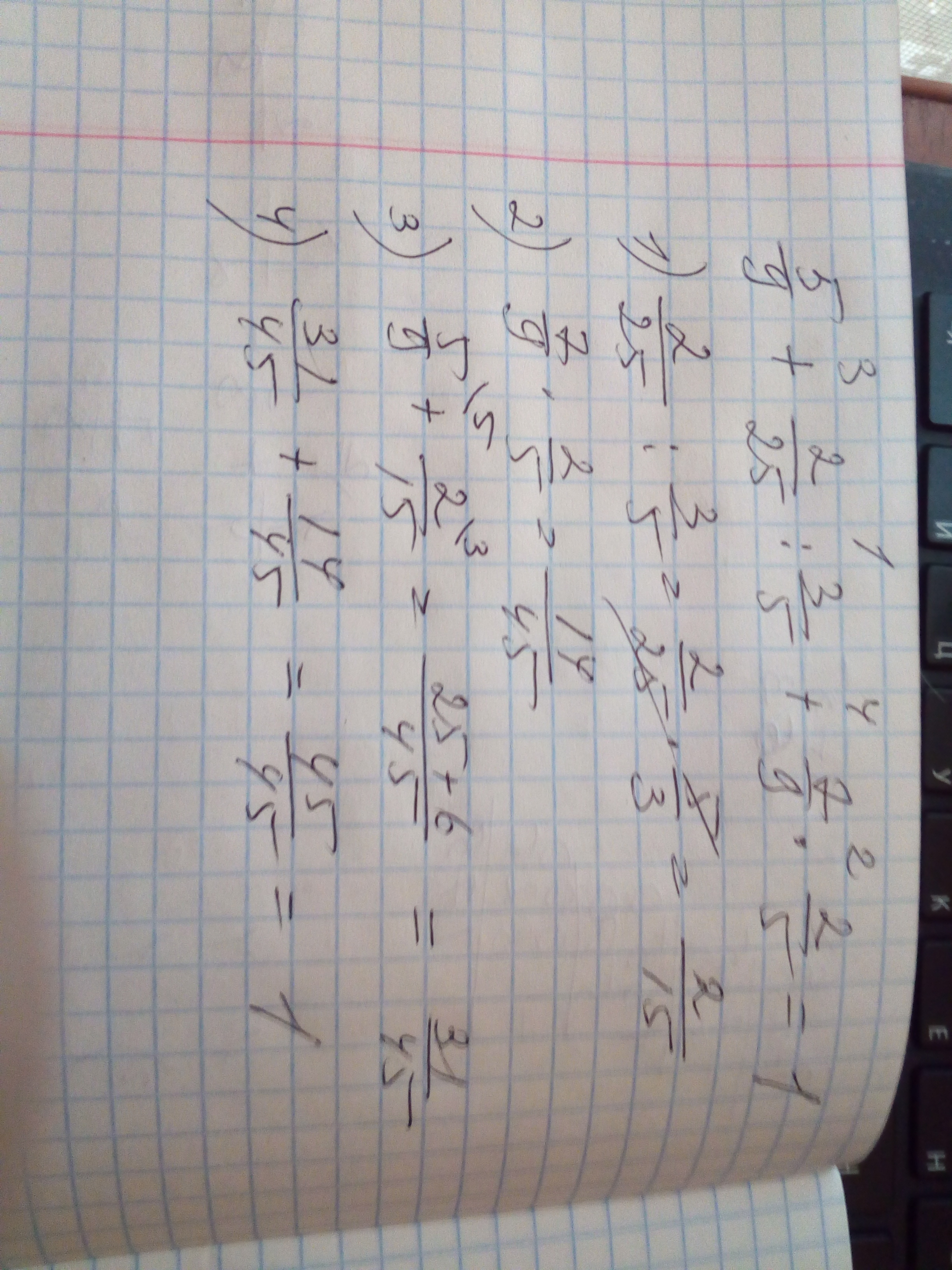 Спочатку поділимо дроби 2/25:3/5. Скорочуємо 5 і 25, отримуємо 2/3*5 = 2/15. Далі множимо дроби 7/9*2/5 = 14/45. Потім перші два дроби зводимо до спільного знаменника 45, домноживши перший дріб на 5, другий дріб на 3. Отримуємо приклад 25/45+6/45+14/45. Зводимо всі ці дроби, додаючи, і отримуємо 45/45 = 1. Повний числовий розв'язок (без пояснень):