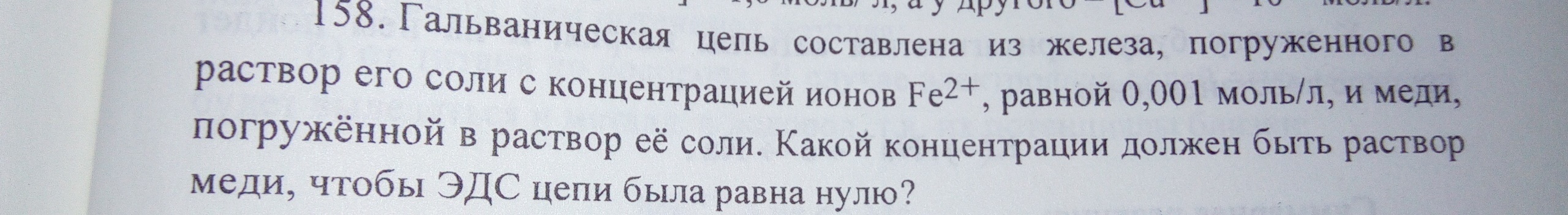 Задача. Гальваническая цепь составлена из железа, погруженного в раствор его соли с концентрацией ионов Fe(+2), равной 0,001 моль/л, и меди, погруженной в раствор её соли. Какой концентрацией должен быть раствор меди, чтобы ЭДС цепи была равна нулю?