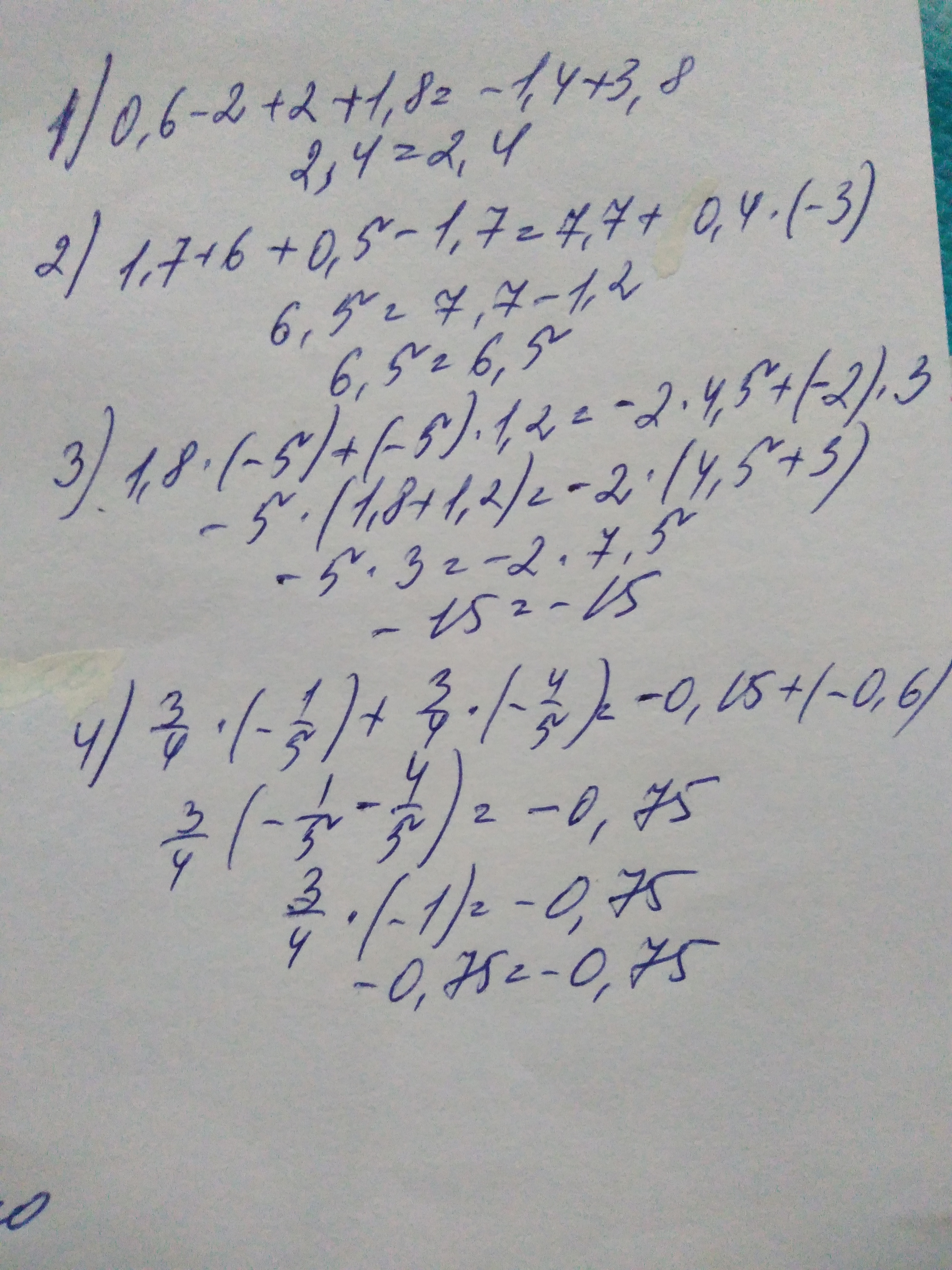 выполните почленное сложение верных числовых равенств: 1)0,6-2=-1,4 и 2+1,8=3,8; 2)1,7+6=7,7 и 0,5-1,7=0,4*(-3); 3)1,8*(-5)=(-2)*4,5 и (-5)*1,2=(-2)*3; 4)3/4-по середине это дробная палочка,но не деление:3/4*(-1/5)=-0,15 и 3/4*(-4/5)=-0,6.Заранее спасибо❤