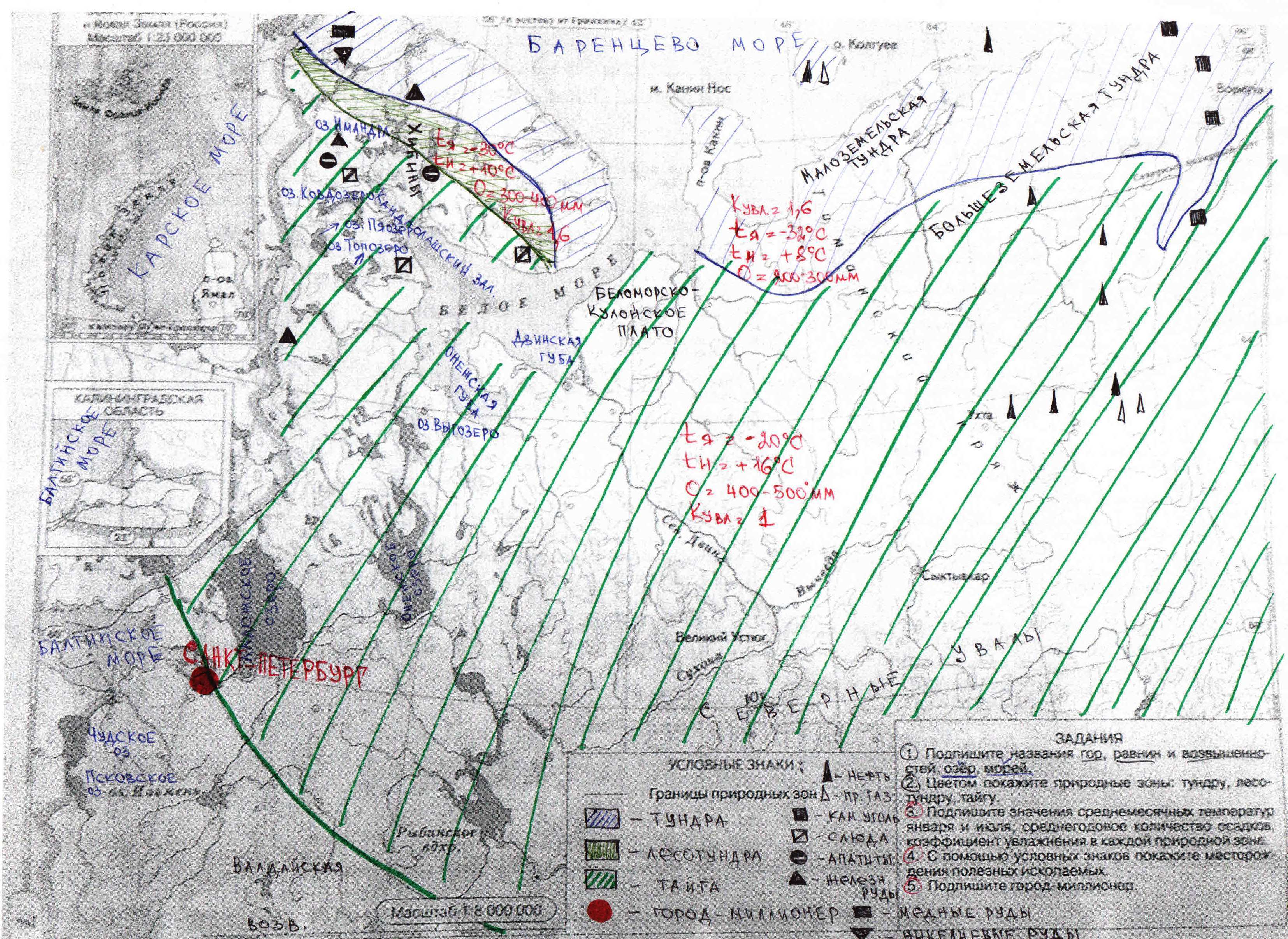 3. Подпишите значения среднемесячных температур января и июля, среднегодовое количество осадков, коэффициент увлажнения в каждой природной зоне.