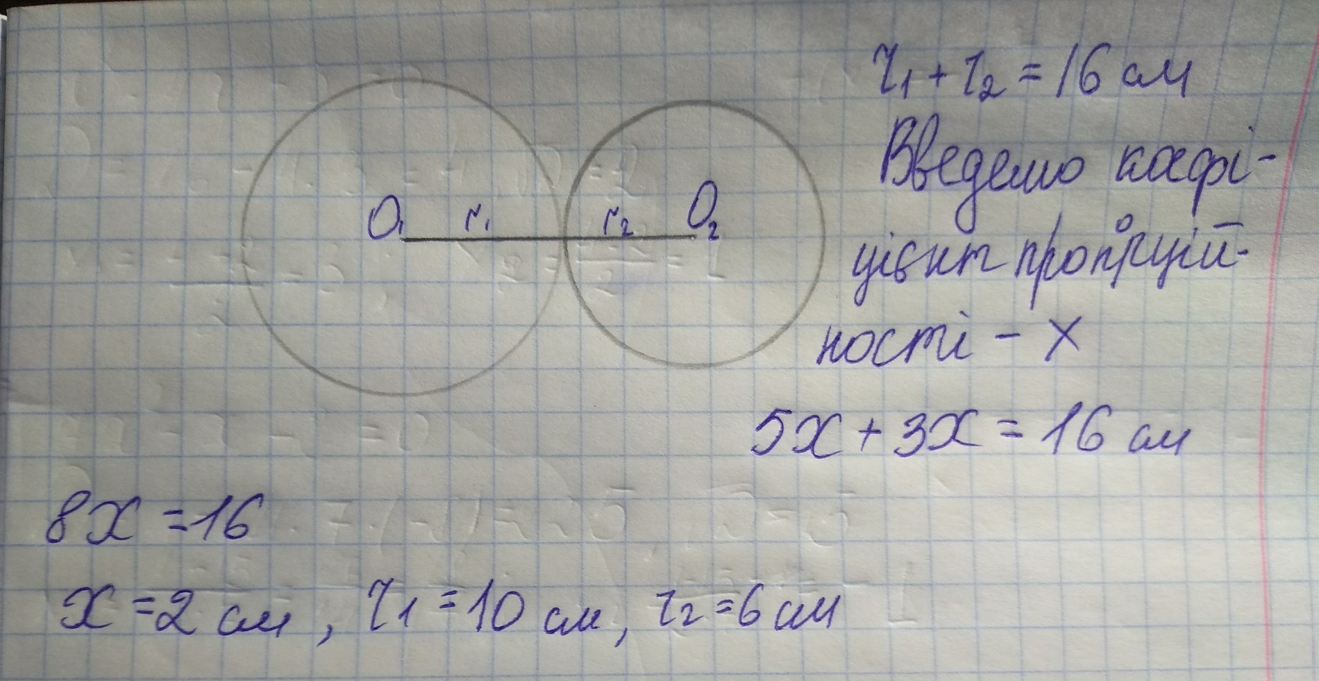 Відстань між центрами двох кіл, що дотикаються, дорівнює 16 см. Знайдіть радіуси цих кіл, якщо вони відносяться як 5 : 3. Розгляньте всі можливі випадки.