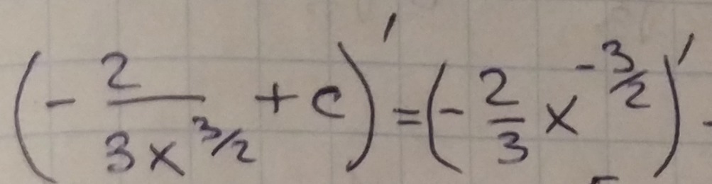 А дробь преобразовалась так, ты умножаешь на -2/3 а x^(3/2) ты должен записать в числитель, для этого берешь степень -1.