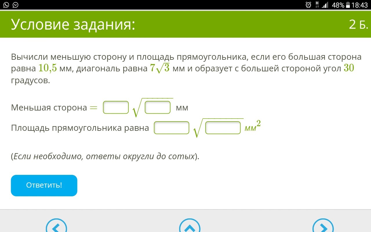 1) меньшая сторона равна 3,5√3мм катет, лежащий против угла в 30°; площадь равна 10,5 · 3,5√3 = 36,75√3 мм²